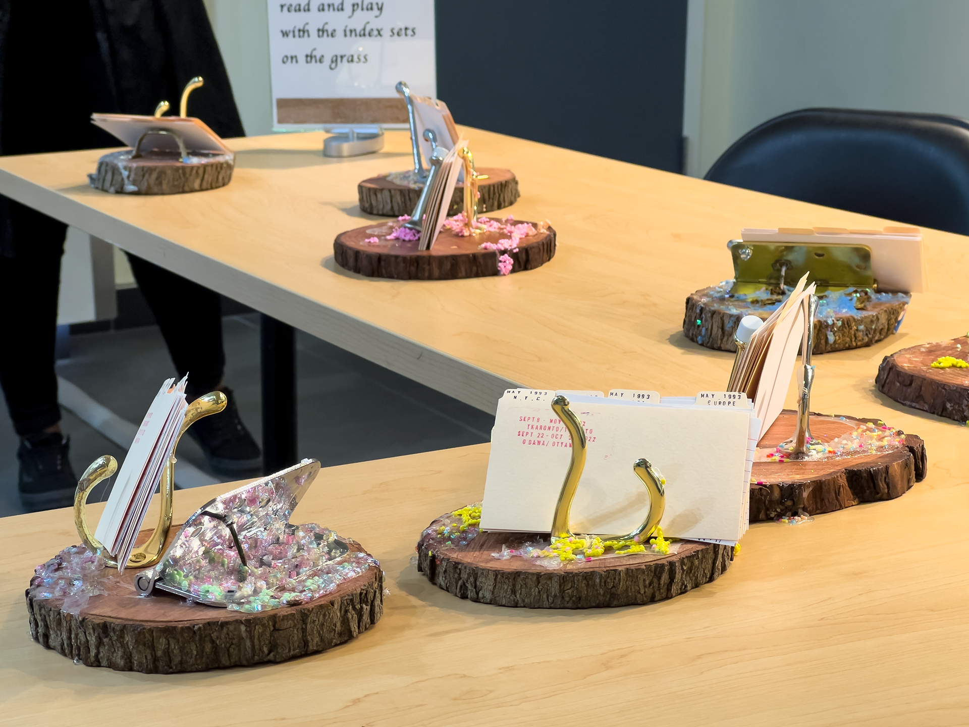 2020-2022. Fifteen National Geographic Magazines (published every May from 1986-2000), index cards (3”x5”), index label cards (3”x5”), glycerol, a stain glass table (39.37”x78.74”), chairs, playfoam, spark colour, borax, glue, wood butter, wood (diameter: 2.2”), copper, metal, a lamp (10.5”x8.6”x14.75”) & audience's participation. Variable dimensions.