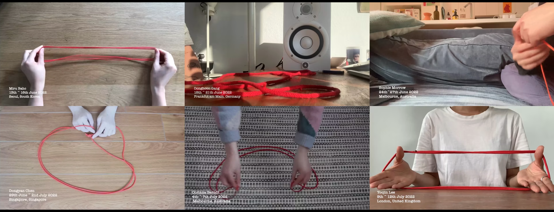 2022-2023. Seven-channel video installations (HD, colour, sound, loop, variable dimensions), 46 photography (archival Canson Baryta Photographique, variable dimensions), indexical words, Dashes out of the Room (transcription poem, string figure inventions in drawing, videos, notations, and photography textured paper, OHP film, 8.5” X 11”).