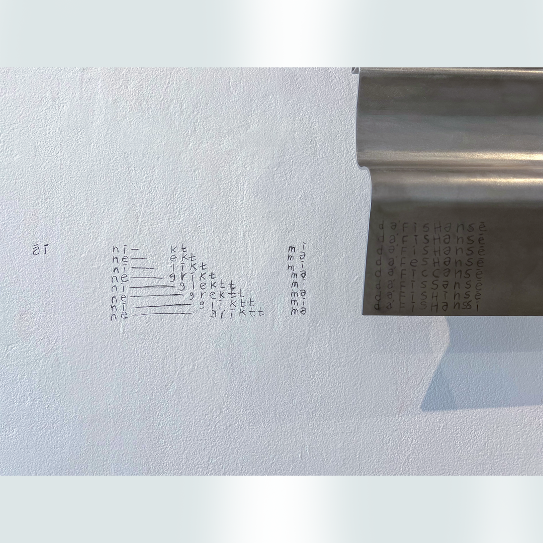 Second iteratation: 2024. aluminum stainless (60cm x 30cm), riddle texts written in graphite, music boxes, music box note sheets & audiences’ participation.